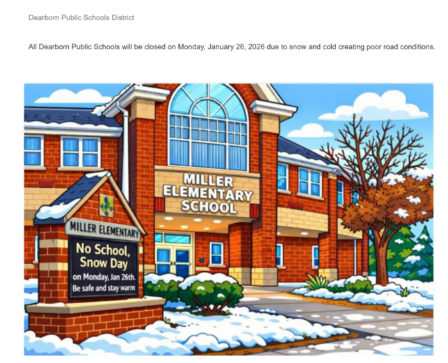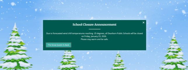 | Dearborn Public Schools District Dearborn Public Schools District Sheeeeeeeeeeeee’s back! Due to forecasted windchill temperatures reaching -25 degrees, all Dearborn Public Schools will be closed on Friday, January 23, 2026. Please stay warm and be safe. The Snow Queen Is Back |