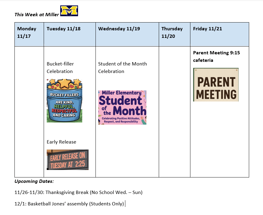 On Tuesday, Early Release dismissal is at 2:25 p.m. In addition, Parent Teacher Conferences begin at 2:25 as well. This year, all parents will meet with their child’s teacher at their scheduled conference time- only. No walk-ins will be permitted.
