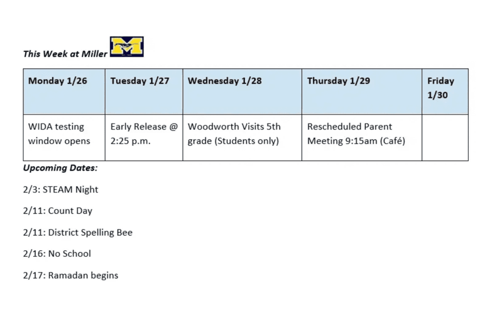 مرحبًا بكم في نشرة هذا الأسبوع لأولياء أمور مدرسة ميلر الابتدائية!
